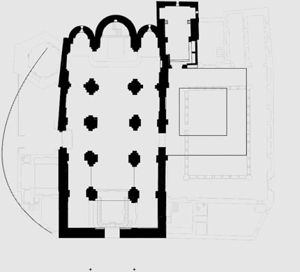 - planta basilical con tres naves, la central con mas anchura y altura, culminadas con ábsides de planta semicircular