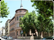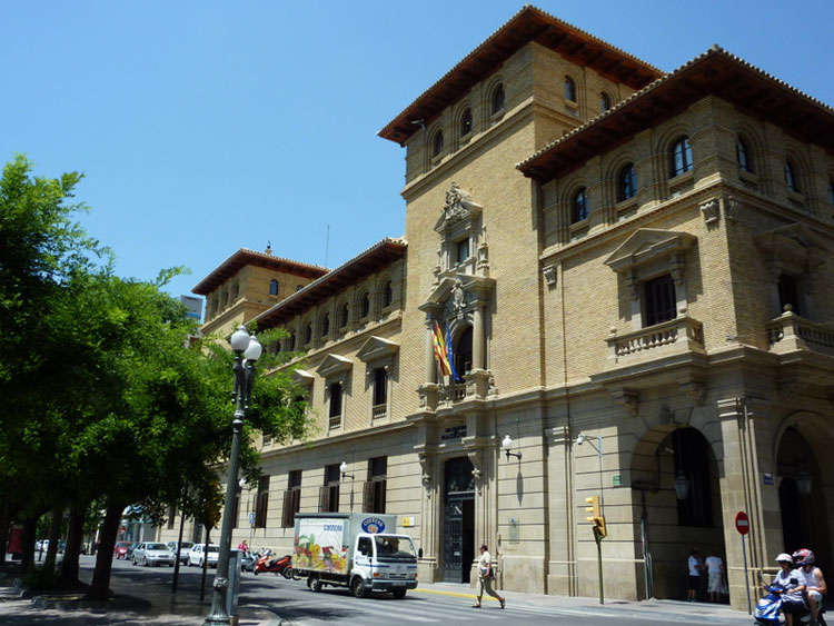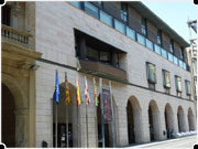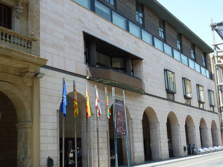 PALACIO DE LA DIPUTACIóN PROVINCIAL DE HUESCA.- Obra de Ramón Artigues y Ramón Sanabria, realizada en 1986-88, es característico de la nueva arquitectura, que reinterpreta la estructura porticada de la calle y traza su fachada principal según pautas visuales clásicas. Su interior ofrece una gran salón de entrada, y salas como la de Saura en la que pintó su techo con la obra “Elegía”, así como otra de exposiciones con sus restos romanos conservados y a la vista; y el Salón de actos con capacidad para doscientas personas; por la escalera lateral subimos a la primera planta con salón para los diputados; y otras dependencias para oficinas.